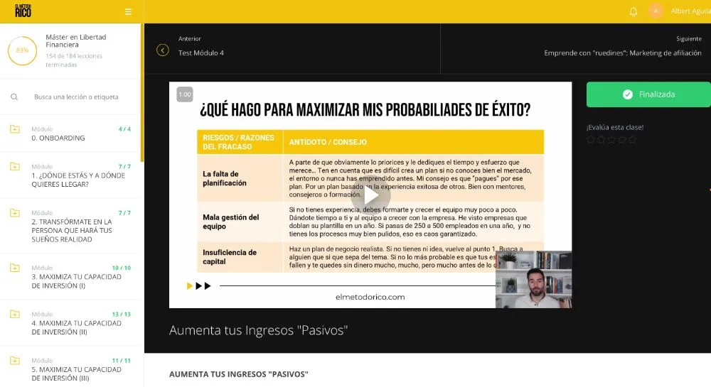 - Contenido extenso y profundo: Hay mucho material por cubrir, y algunos módulos (como el módulo 8) son especialmente densos. Sin embargo, las sesiones 1 a 1 tras cada módulo ayudan a fijar conceptos y avanzar con un plan de acción claro.